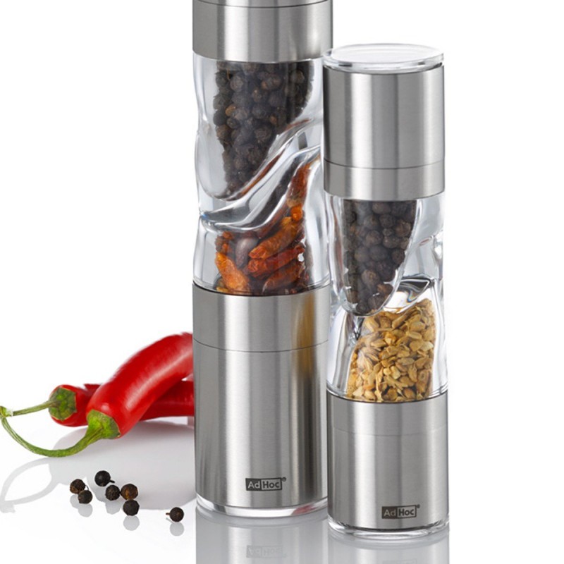 Mit original AdHoc SchneidWerk® für getrocknete Kräuter und Gewürze wie z.B. Chili, Ingwer, Sesam, uvm. und mit Hochleistungs-Ceramic Mahlwerk für Pfeffer und Salz