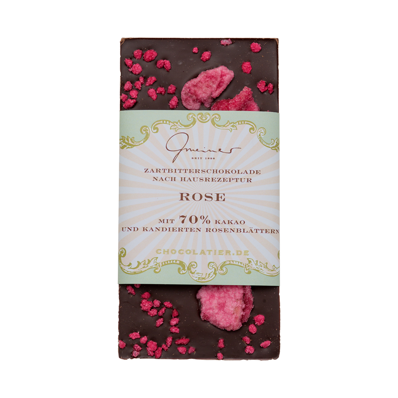 Feinste handgeschöpfte Zartbitterschokolade mit einem Kakaoanteil von 70 %. Die Kakaobohnen für diese Schokolade stammen von den besten Anbaugebieten Südamerikas, und sorgen für ein intensives Aroma. Natürliches englisches Rosenöl und feinste kandierte Rosenblütenblätter geben ein feinsubtiles Aroma und eine edle Note.