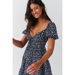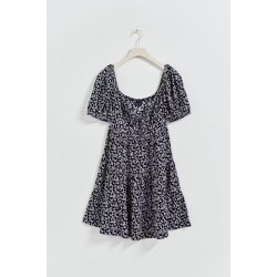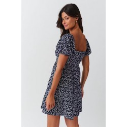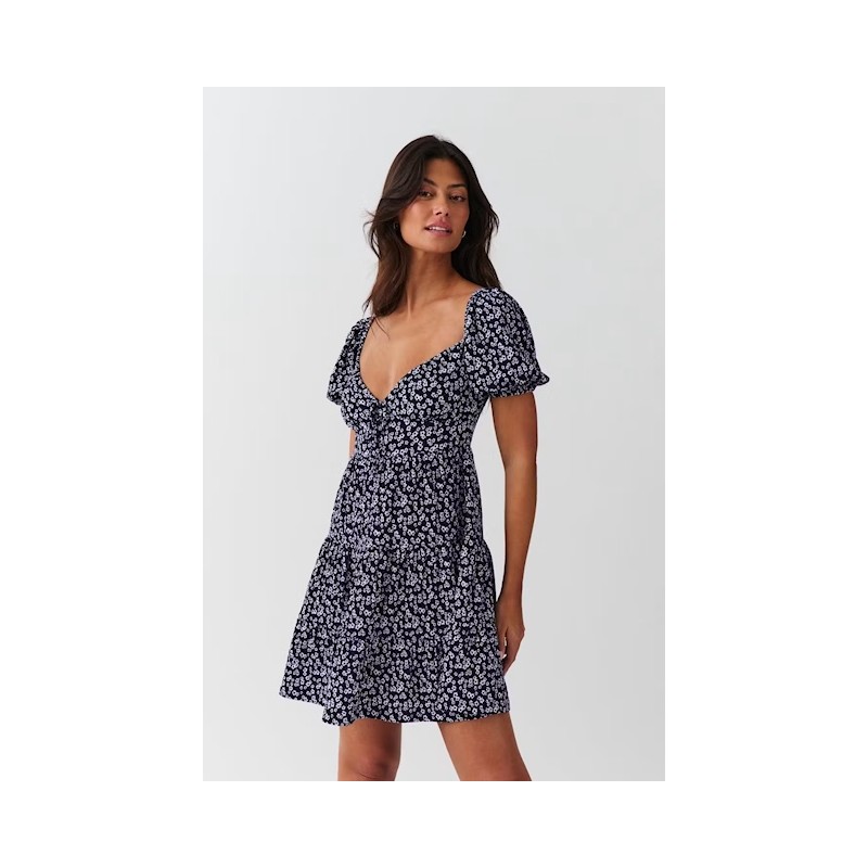 Kurzes Kleid aus Jersey mit einer normalen Passform. Das Kleid ist blau und hat Rüschen-Details an der Unterkante. Es hat Selbstbindung vorne, normale Passform, V-Ausschnitt, kurzen Puffärmel und Gummiband an den Ärmelenden und um die Schultern herum.