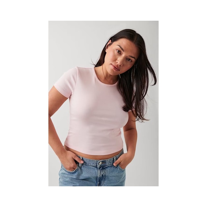 Grösse LKurzärmliges Oberteil aus Jersey mit gerippter Qualität. Das Oberteil ist rosa und hat taillierte Passform. Es hat Rundhalsausschnitt und abgeschnittene Länge.