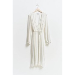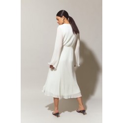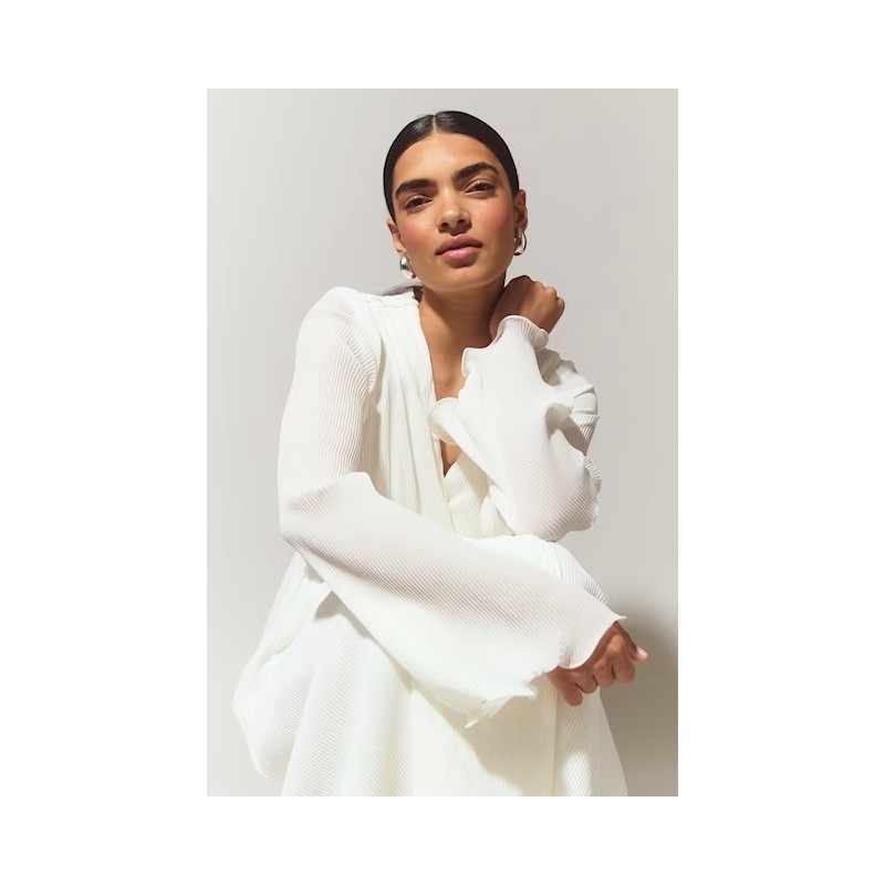 Grösse 38-Plissiertes Wickelkleid mit Selbstbindung in der Taille. Das Kleid ist weiβ, langärmlig und gefüttert. Es hat elastische Qualität, Wickeloberteil mit V-Ausschnitt, breiten Ärmel mit schwankendem Ärmelende und Midi-Länge.