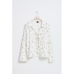 Grösse MBlumiges Pyjama-Shirt mit Selbstbindung vorne. Das Hemd ist weiβ und hat Oversize-Passform. Es hat Kragen, langen Ärmel, V-Ausschnitt, Öffnung vorne und normale Länge.