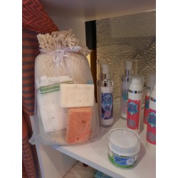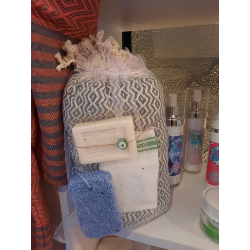 In unserem Exklusiven Geschenke Set sind Hamam-Tuch, B2 Seifentuch, Bimsstein & B2 Seife in einem ansprechenden weißen Tütchen mit dem Auge.
