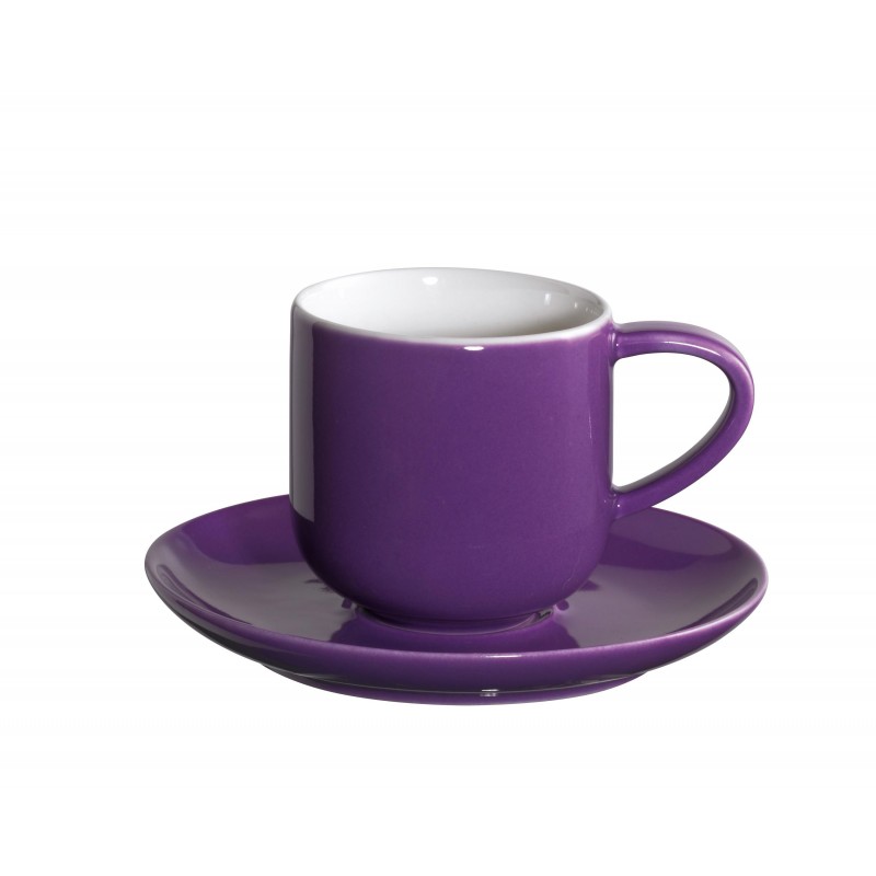 Lila Espressotasse mit Unterer im 2er Set aus der ASA Selection coppa. Die Porzellantasse ist innen und außen glasiert und glänzt elegant. Innen ist sie schneeweiß, außen in einem kräftigen mauve gehalten. Die Espressotasse hat einen Durchmesser von 5,8 cm und ist 5,6 cm hoch. Sie hat genug Platz für einen kleinen Espresso mit samtiger Crema.