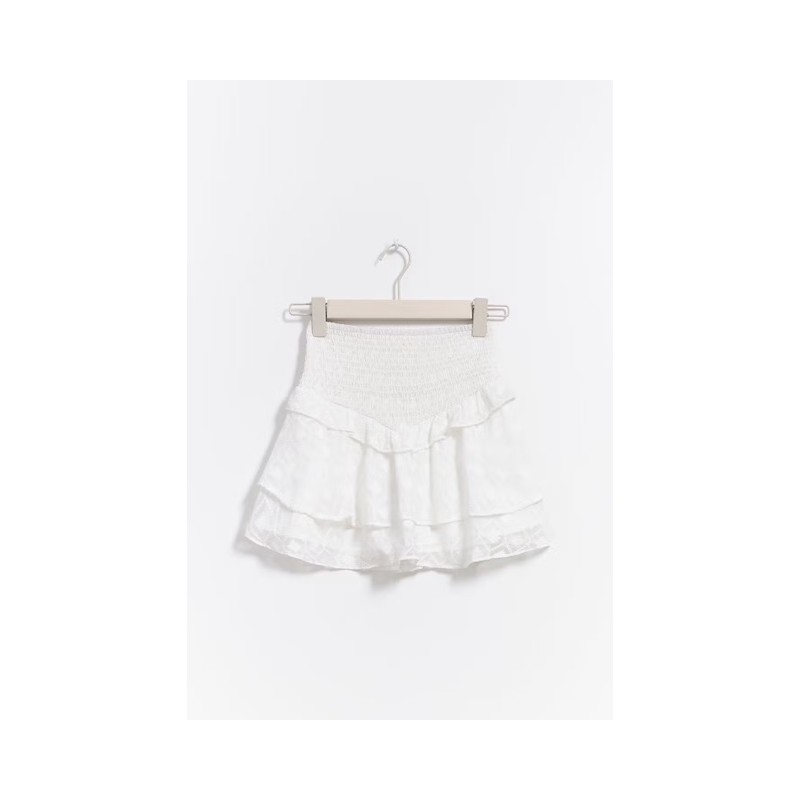 Grösse xS (170)-Kurzer Rüschenrock mit gesmokter Taille. Der Rock ist weiβ und hat normale Passform.