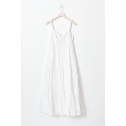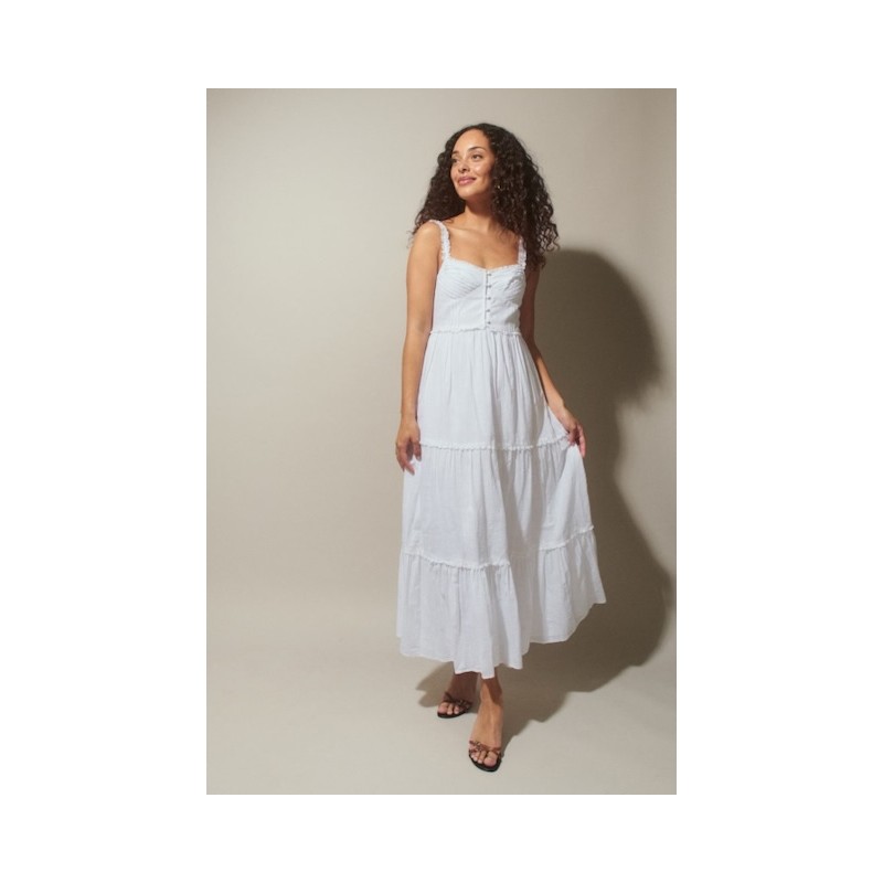 Ärmelloses Maxikleid mit Knöpfen vorne. Das Kleid ist weiβ und hat verstellbare Trägerbänder mit Rüschen-Details. Es hat normale Passform, Smoking am Rücken und Rüschenröcke mit Raffnähten. Gefüttert.
